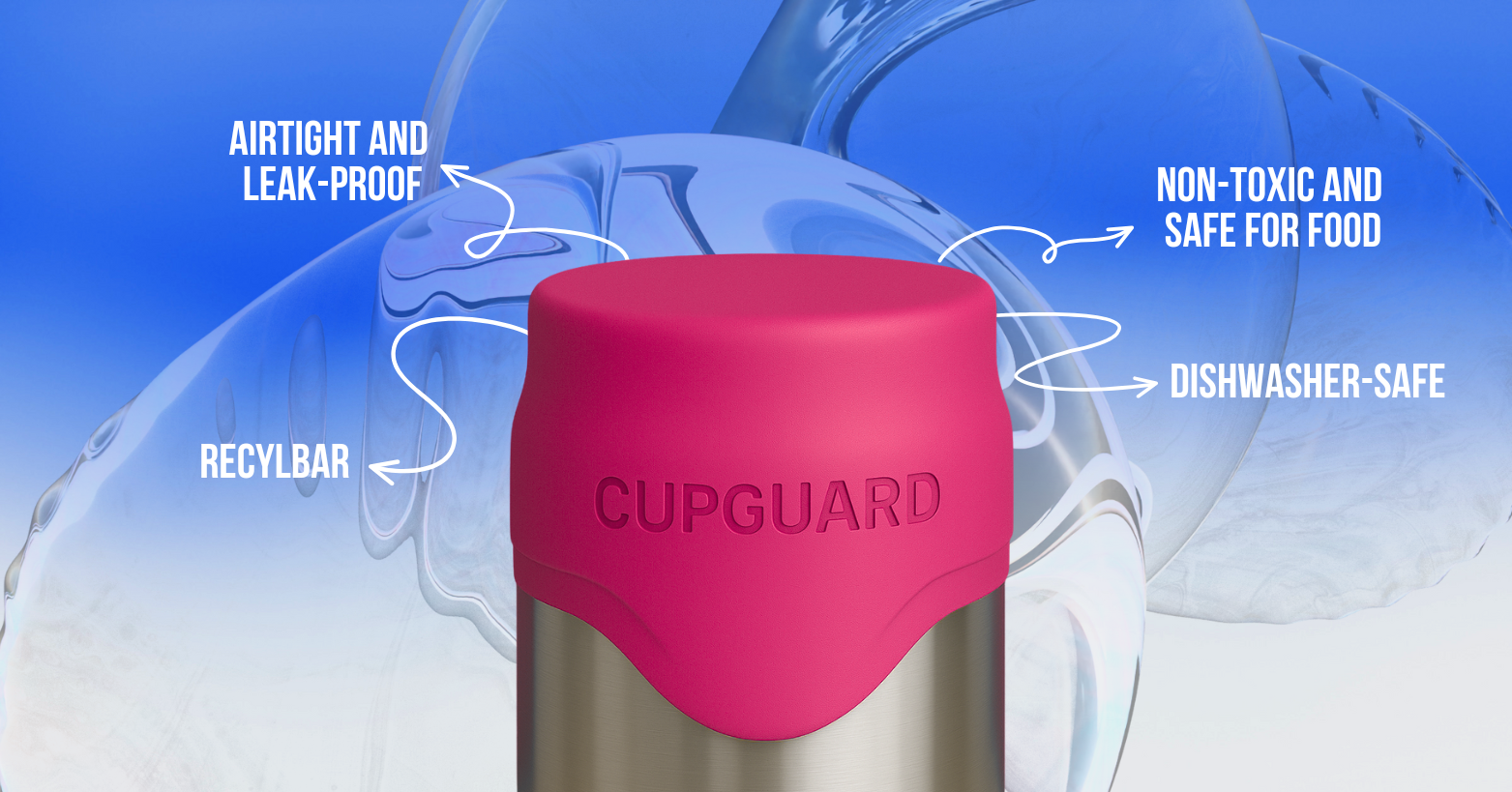 The CupGuard is a stretchable silicone cover that you pull over the lid of your bottle to reliably protect it from leaking. It prevents expensive damage to your laptop, phone, or books in your bag caused by leaky bottles.